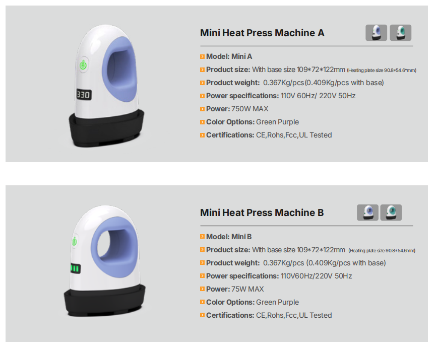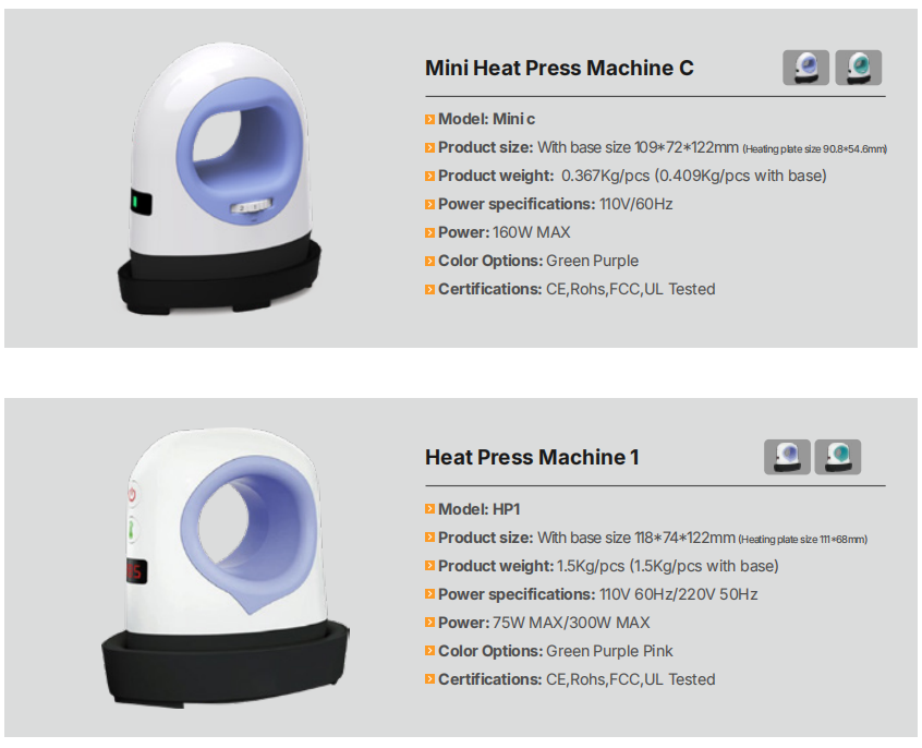 This 4-model mini heat press machine lineup delivers portable, efficient heat transfer for DIY crafts, apparel, and small custom projects. With compact ergonomic design, multiple power options, consistent heating performance, and universal voltage compatibility. Available in various colors, all certified CE/RoHS/FCC/UL, ideal for home and small business personalized printing needs.